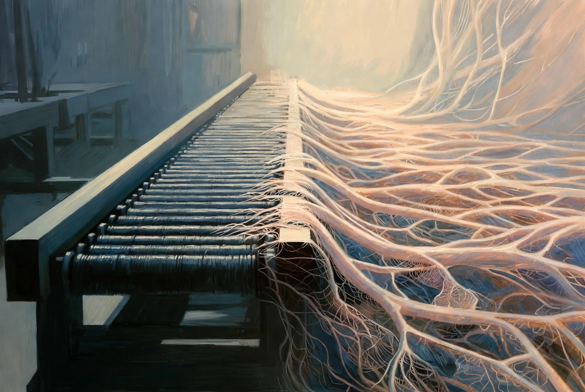 The pipeline view, in February, was a single feature flowing through stages. The nervous-system view is harder to draw because there is no single flow. There are dozens of partial ones, overlapping, all the time.